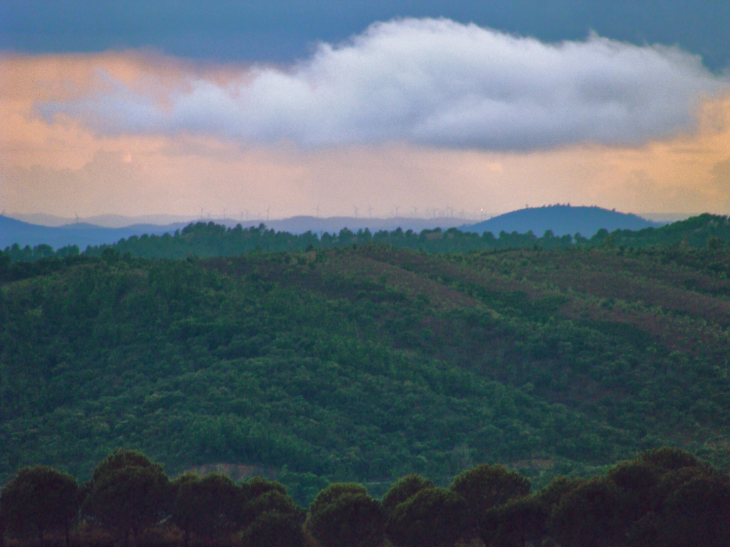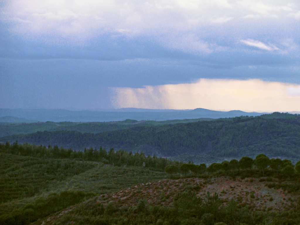 I don’t appreciate blogging normally, to me it means valuable time wasted sharing the equivalent of the contents of your navel, while I could be out in the garden. Right now though it’s pouring with rain, the first serious shower we’ve had for a year, and I took some photos that I think are worth sharing. Why? Because for the first time the really cheap automatic digital camera we have has produced images that show something of the views from here. At 600 metres we have a spectacular 180 degree vista that at night stretches over 60 km into the distance, as far as the wind farm on the border with Portugal. However, without a manual focus and f-ring usually impossible to record. These storm shots give the best idea yet.
