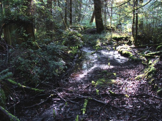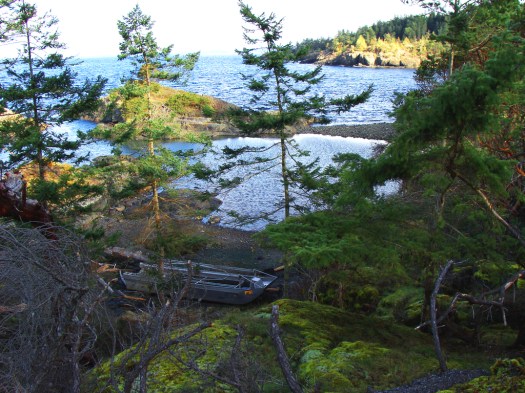 A couple of days later and here we are. Living in a forest, hundreds of years old, and with trees bigger and higher than I’ve ever seen. On an island, where our nearest neighbour is 1.5 kms away along a forestry track. Living in a wooden cabin that cantilevers over the ocean. We came on a ferry, were given a quick tour of everything, then drove our host to the small airstrip on the island and he took off en-route back to Los Angeles. There are no keys, not to the houses or the pickup. At night it is pitch-black, except for the lights over the strait on Vancouver Island. The forest is full of wildlife – deer, racoons, beavers, eagles, owls, you name it. Our water supply is the river. If a tree comes down across the track we are expected to saw it up (for firewood) with the chainsaw that lives permanently in the pickup. Yet it all this seems totally natural, not at all daunting. The only downside is we still haven’t got any further with finding a way to stay permanently in Canada, not unless we move on to somewhere even more remote and live as illegal immigrants until the next amnesty comes along and grants us residency. Our host likes to give the impression he has a lot of influence locally in these matters, so we will have to see, or we might meet someone else with another scheme. Who knows? The number of coincidences already have been huge, maybe there will be more.