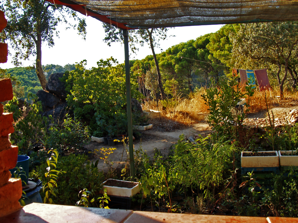 First, here’s the promised photo of our newly installed pergola.  Under which are now the trays of hardy seeds sown in October which are showing through, and about 300 trees/shrubs in pots from the previous year, waiting for planting in October if we can find the cash to fence in another acre of the garden …