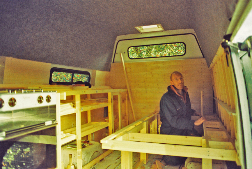 Fitting-out started with bolting a wooden frame to the metal wall struts.  Insulation came next, followed by tongue & groove panelling.  By then I’d realised the inside walls were not vertical, so everything else was made free-standing then bolted onto the walls. If you use bolts make sure they are the type that lock with a nylon sleeve, or the vibration when driving will undo them.