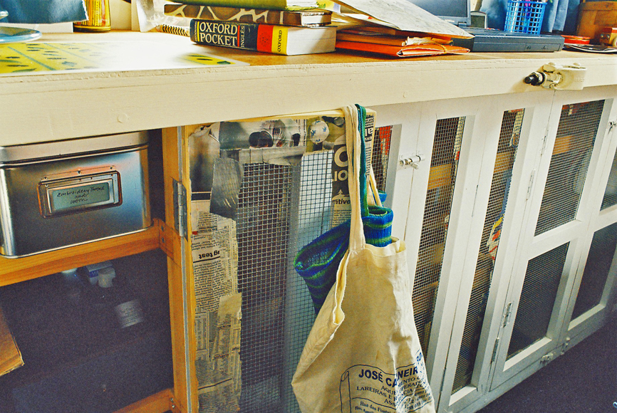 Designing and building the bed took the longest.  Ideally it would have gone across the new rear wall, like a bunk bed, but I’m very tall and felt this would be uncomfortable over a long time.  A mistake in retrospect, because located along the side wall took up a lot more floor space.  I used the idea of a futon sofa-bed, so at night opened out as a double bed.  On the opposite wall was a continuous worktop, with cupboards underneath, and the cooker.  Books and small things went on shelves (with fronts) on the walls.