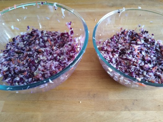 All the cut/ grated vegetables go in the mixing bowl (I used two as I don’t have one big enough). As you do this, sprinkle salt evenly throughout.