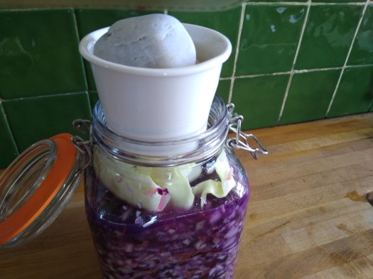 Then decant everything into the 500g jars, using a pestle to pack it down so there are no air pockets. When a jar is full there should be a layer of the liquid on top covering the vegetables (if not use what you saved).