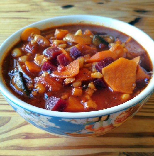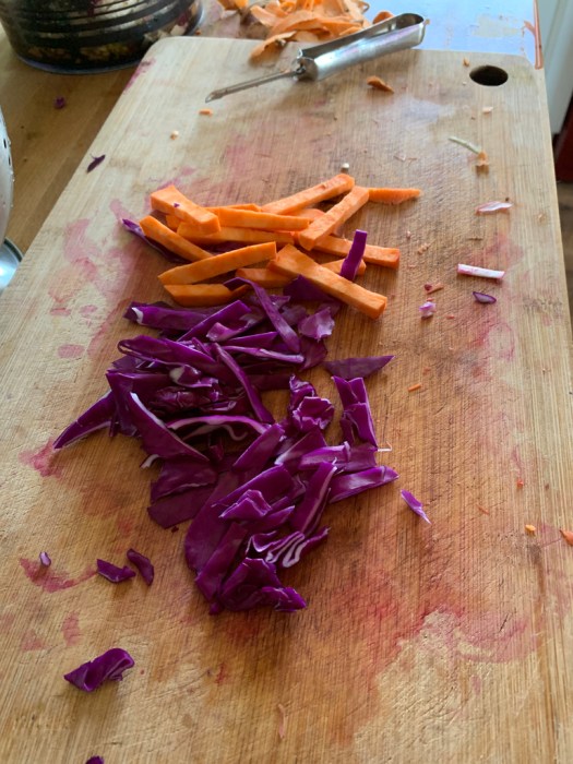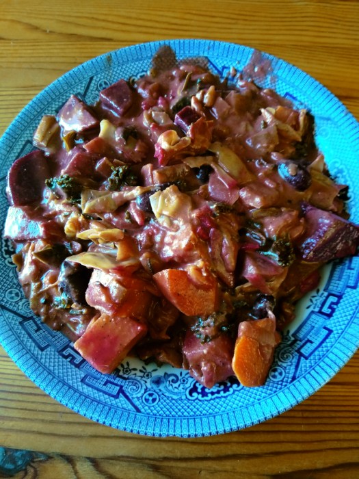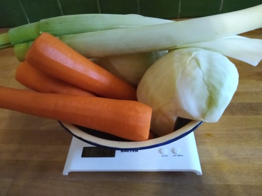 2 kg of vegetables (peeled & chopped weight) Of which approximately 600 gm is any kind of cabbage including curly kale, 500 gm is beetroot, plus a selection from the following: carrot, leek, sweet potato, red pepper, swede, parsnip, pumpkin, turnip, celery, green beans, plus anything else you think might be tasty….