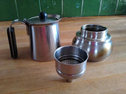 A stainless steel Bialetti New Venus – 2 cup Moka pot. Which we bought when we were living in British Columbia, back in 2007/8, but is still as good as new today. It’s called a 2 cup, but this is confusing as it really only makes the equivalent of one (double) espresso. To buy one of these today will cost about £30.