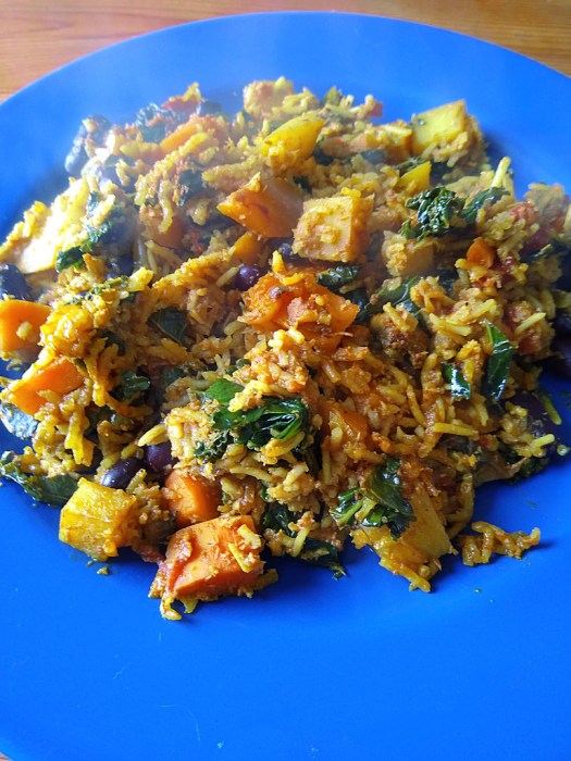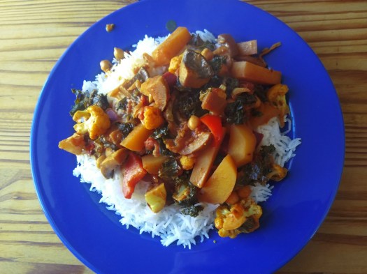 Rice is featured a lot. I’ve listed it here as basmati, but actually we prefer brown/ whole grain. Basmati is a lot simpler though. If you wash it thoroughly (to get rid of the starch) first, then soak in a bowl of boiling water for an hour, followed by cooking, the taste is better. Or, as I prefer, wash/ soak for an hour in cold water/ then cook for two minutes in a pressure cooker. 1/3 of a cup to 1/2 a cup per person is a good portion.
